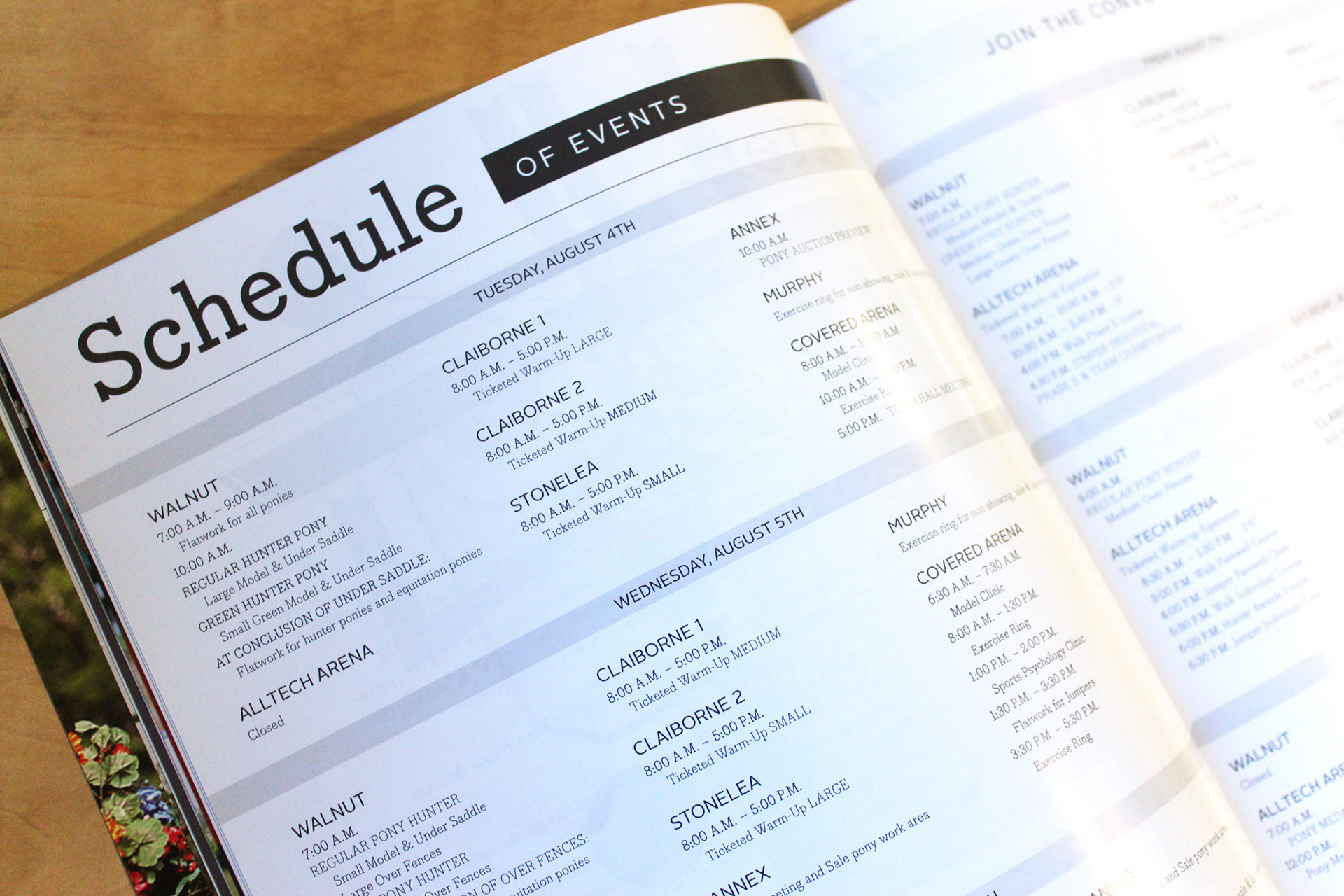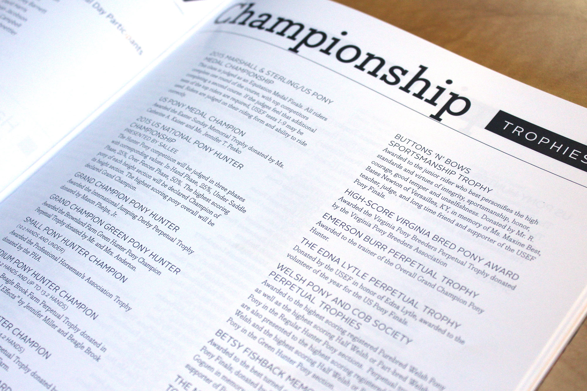I collected data for the Pony Finals program and arranged layout and typography for the full list of participants, schedule of events, and relevant participant information. I also edited photography and created illustrations for young attendees to color.